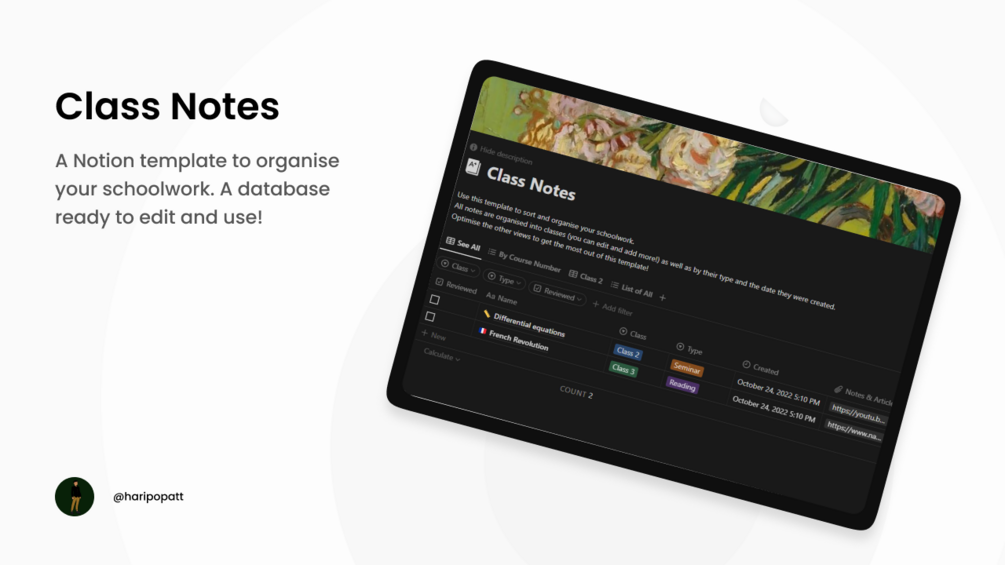 Use this template to sort and organise your schoolwork. All notes are organised into classes (you can edit and add more!) as well as by their type and the date they were created. Optimise the other views to get the most out of this template!